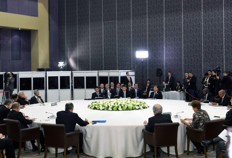 11月15日,金砖国家领导人非正式会晤在土耳其安塔利亚举行,中国国家主席习近平、俄罗斯总统普京、印度总理莫迪、南非总统祖马、巴西总统罗塞夫出席。习近平在会上发表题为《开拓机遇应对挑战》的重要讲话。新华社记者 饶爱民 摄