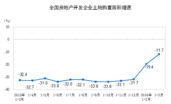 1-3月份,房地产开发企业土地购置面积3577万平方米,同比下降11.7%,降幅比1-2月份收窄7.7个百分点;土地成交价款1165亿元,增长3.7%,增速提高2.8个百分点。