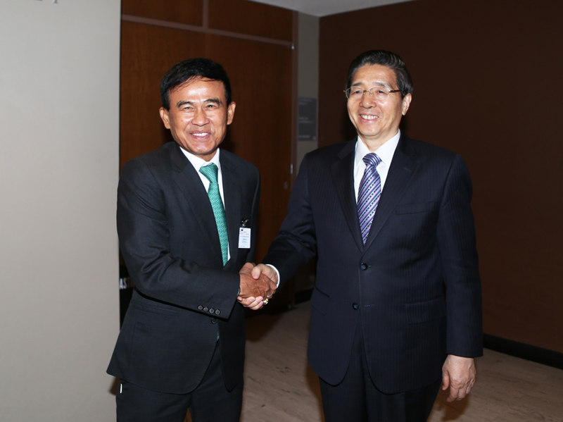 4月19日,在纽约联合国总部,中国国务委员、国家禁毒委员会主任、公安部部长郭声琨(右)在参加2016年世界毒品问题特别联大期间会见泰国司法部长派汶。新华社记者 秦朗 摄