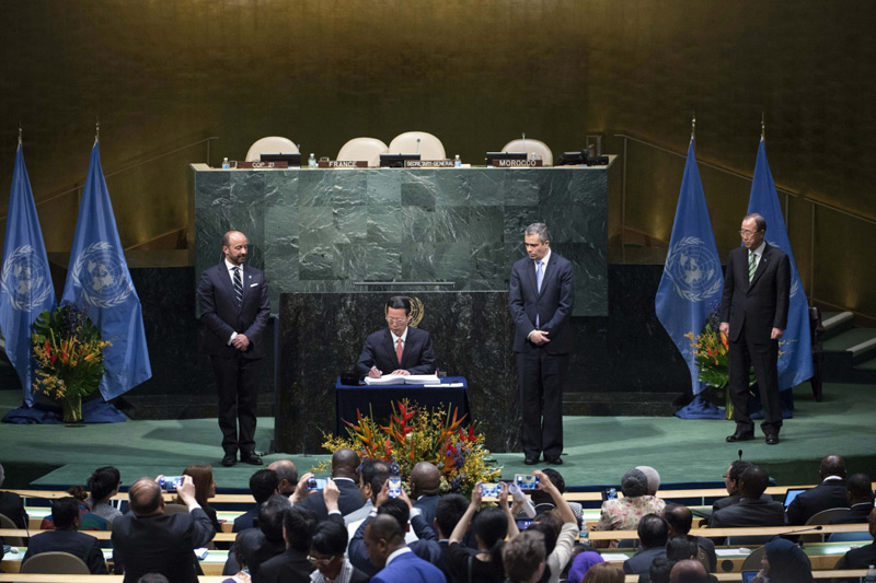 4月22日,中国国家主席习近平特使、江南平台入口 副总理张高丽在纽约联合国总部出席《巴黎协定》高级别签署仪式,并代表中国签署《巴黎协定》。新华社记者 王晔 摄