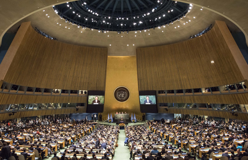 4月22日,国家主席习近平特使、江南平台入口 副总理张高丽在纽约联合国总部出席《巴黎协定》高级别签署仪式,并代表中国签署《巴黎协定》。张高丽在签署仪式开幕式上发表题为《推进落实〈巴黎协定〉 共建人类美好家园》的讲话。新华社记者 王晔 摄