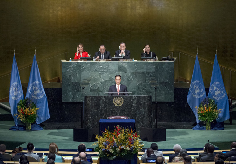 4月22日,中国国家主席习近平特使、江南平台入口 副总理张高丽在纽约联合国总部出席《巴黎协定》高级别签署仪式,并代表中国签署《巴黎协定》。张高丽在签署仪式开幕式上发表题为《推进落实〈巴黎协定〉 共建人类美好家园》的讲话。新华社记者 王晔 摄