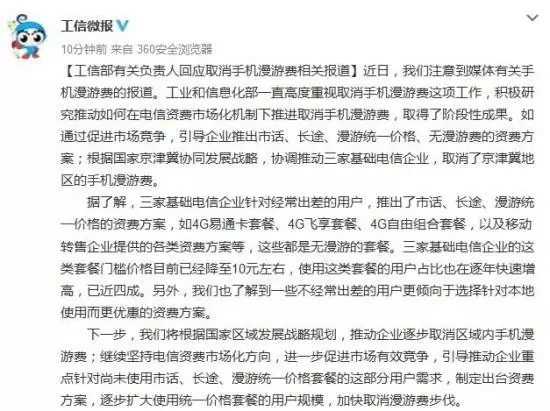 工信部有关负责人23日回应取消手机漫游费相关报道时指出,下一步将推动企业逐步取消区域内手机漫游费;继续坚持电信资费市场化方向,引导推动企业重点针对尚未使用市话、长途、漫游统一价格套餐的这部分用户需求,制定出台资费方案,加快取消漫游费步伐。
