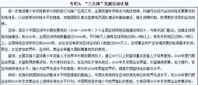 ——体育重点领域改革取得新突破,体制机制创新取得新成果。加快政府职能转变,推进足球项目改革试点,加速职业体育发展,创新体育社会组织管理和体育场馆运营,逐步完善与经济社会协调发展的体育管理体制和运行机制,基本形成现代体育治理体系。