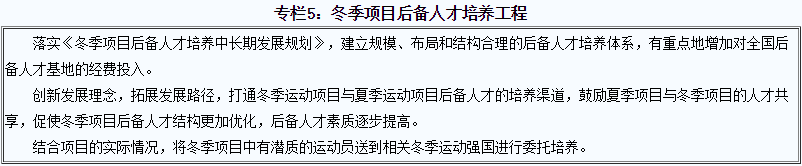 以北京冬奥会全面参赛为目标,扩大冬季运动开展规模,提高基础设施投入力度。落实《国家体育总局2022年北京冬奥会备战工作计划》,优化冬季项目的结构布局,建立完善国家、省市、社会、高校四级体系,巩固扩展短道速滑、花样滑冰、速度滑冰和空中技巧、单板滑雪等项目的基础和水平,加大冰球和高山滑雪等落后项目的政策扶持措施和投入力度,大力发展雪车、雪橇和北欧两项等新开展项目。精心打造各运动项目国家队,完善国家队的组建、选拔、训练、管理等各项制度,加强对国家队经费投入、奖励政策、基地建设、后勤服务、情报信息、科研等方面的保障。落实《冬季项目后备人才培养中长期发展规划》,实施“冬季项目后备人才培养工程”,加强高水平后备人才基地的建设,努力改善后备人才培养的训练设施和教练团队。有序推进2018年和2022年冬奥会的备战与参赛工作,力争进入第二集团前列。