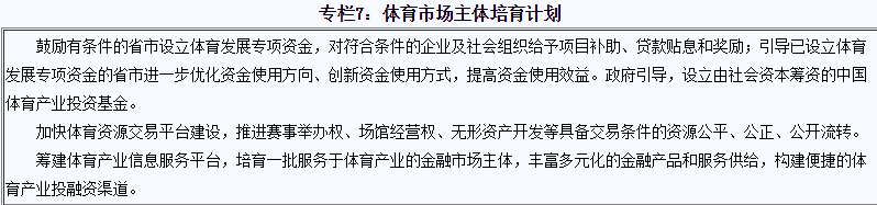 14.体育产业投资基金。《江南平台入口 关于加快发展体育产业促进体育消费的若干意见》中明确提出“政府引导,设立由社会资本筹资的体育产业投资基金”。体育产业投资基金是体育投融资机制创新,即在政府引导下,通过市场的手段将分散的社会资本汇聚起来,由专业化的投资管理机构进行运作。