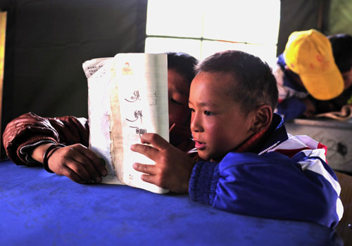 5月13日,西藏昌都市丁青县嘎塔乡中心小学学生在帐篷里上课。5月11日上午9时15分,西藏昌都市丁青县发生5.5级地震,造成震中嘎塔乡60多名村民受伤,嘎塔乡中心小学54名学生家中受灾。为了帮助受灾群众照顾孩子,学校决定临时取消为期一个月的虫草采挖假期,将受灾学生集中起来上课,以保证他们的安全。七顶军绿色的帐篷在嘎塔乡中心小学的空地上有序排列,学生们的朗朗读书声回响在帐篷里。新华社记者 晋美多吉 摄