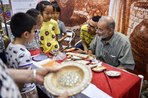 5月15日,小观众在一带一路馆与埃及手工艺人交流。新华社记者 毛思倩 摄