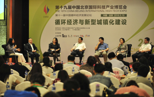 5月19日,与会嘉宾在论坛上以“循环经济新走向”为题展开对话研讨。当日,2016中国北京国际科技产业博览会·第十一届中国循环经济论坛在北京举行。本届论坛以“循环经济与新型城镇化建设”为主题,相关政府部门、行业专家以及企业代表围绕“京津冀协同发展的新维度”“循环经济确保新型城镇化建设科学合理”等议题展开深入探讨。新华社记者 鲁鹏 摄