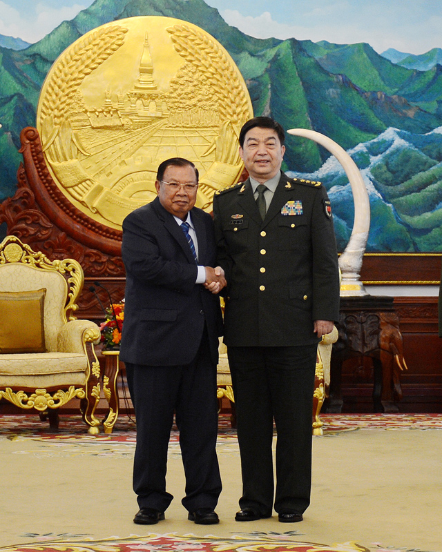 5月26日,在老挝万象,老挝人民革命党总书记、国家主席本扬(左)会见来访的中国国务委员兼国防部长常万全。新华社发(刘艾伦 摄)