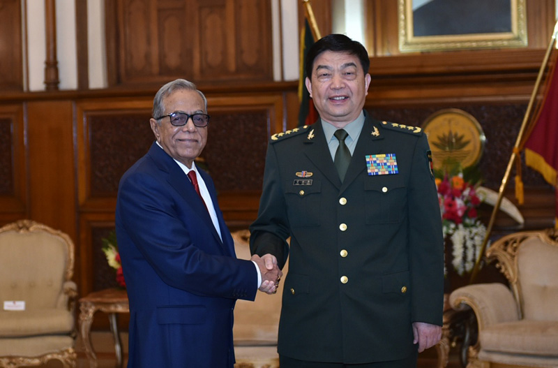 5月29日,在孟加拉国首都达卡,孟加拉国总统哈米德(左)在总统府会见来访的中国国务委员兼国防部长常万全。新华社发