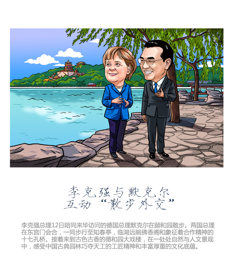 每周一画: 李克强与默克尔互动“散步外交”  中国日报美术部 作