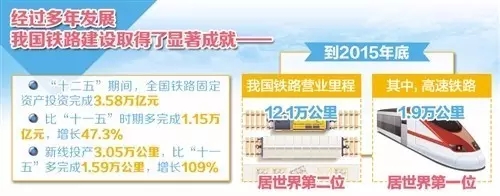 截至2015年底,中国全国铁路营业里程达到12.1万公里(赤道周长约4万公里,中国铁路可绕地球三圈),居世界第二位,看似已经十分发达,但还不到美国的二分之一相对于中国庞大的人口数量,铁路建设还不足,有很大的发展潜力。