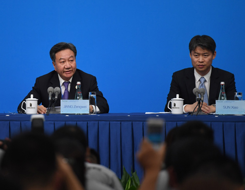 这是2016年B20主席、中国贸促会会长姜增伟(左)在新闻发布会上发言。新华社记者 陈晔华 摄