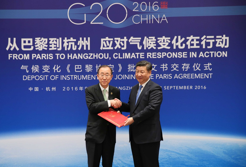 这是习近平向潘基文交存中国气候变化《巴黎协定》批准文书。新华社记者 兰红光 摄