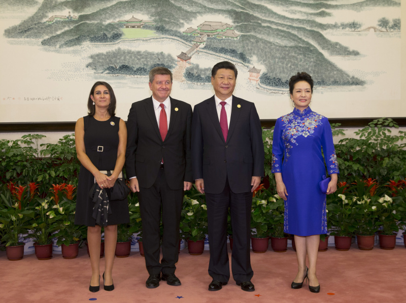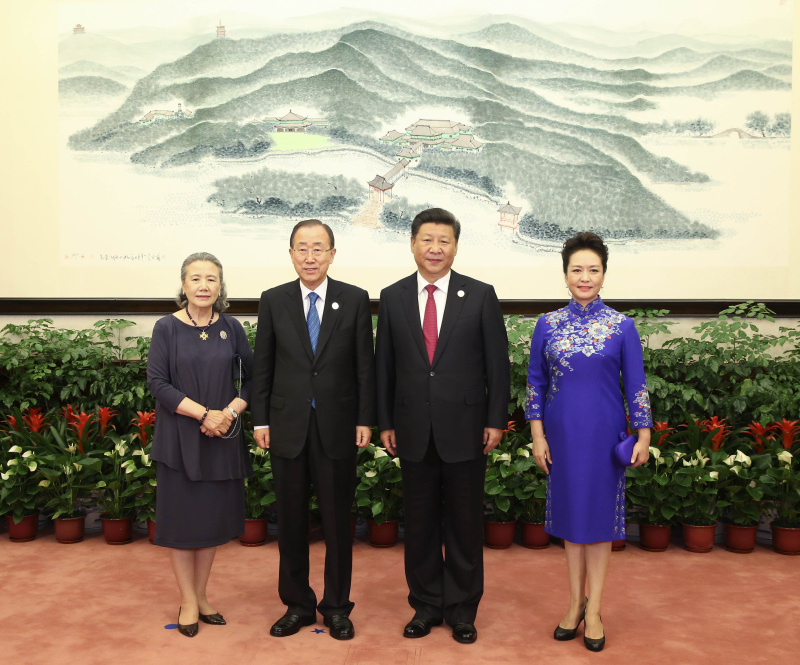 9月4日,国家主席习近平和夫人彭丽媛在杭州西子宾馆举行宴会,欢迎出席二十国集团领导人杭州峰会的外方代表团团长及所有嘉宾。这是习近平和彭丽媛迎候联合国秘书长潘基文夫妇。新华社记者 庞兴雷 摄