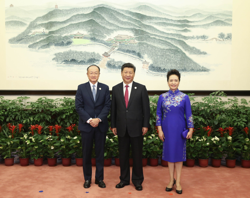 这是习近平和彭丽媛迎候世界银行行长金墉。新华社记者 庞兴雷 摄