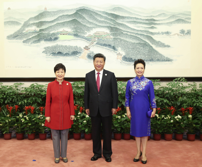 这是习近平和彭丽媛迎候韩国总统朴槿惠。新华社记者 庞兴雷 摄