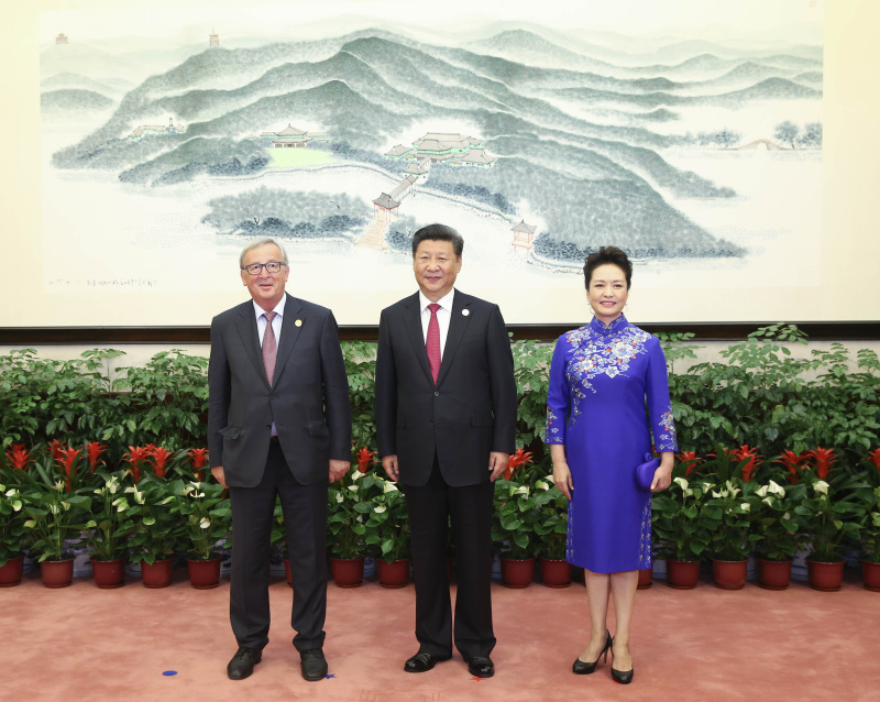 这是习近平和彭丽媛迎候欧盟委员会主席容克。新华社记者 庞兴雷 摄