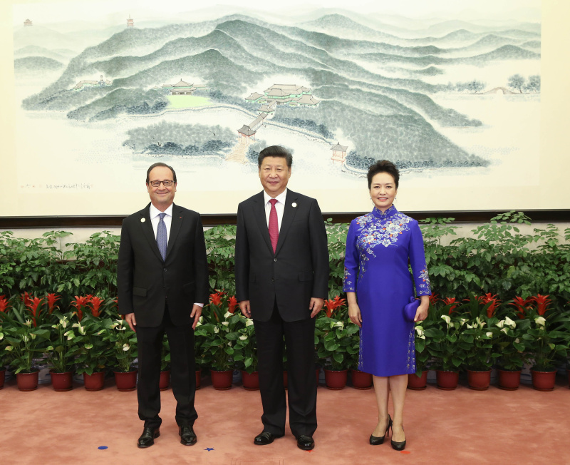 这是习近平和彭丽媛迎候法国总统奥朗德。新华社记者 庞兴雷 摄