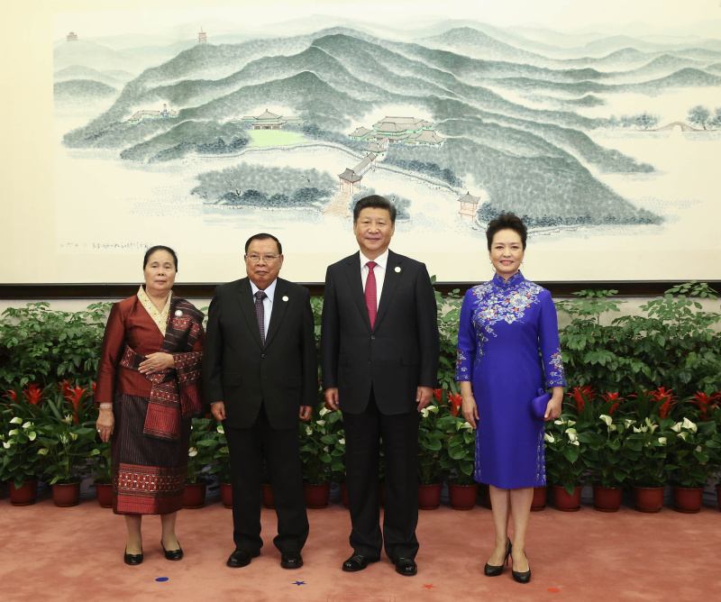 这是习近平和彭丽媛迎候老挝国家主席本扬夫妇。新华社记者 庞兴雷 摄