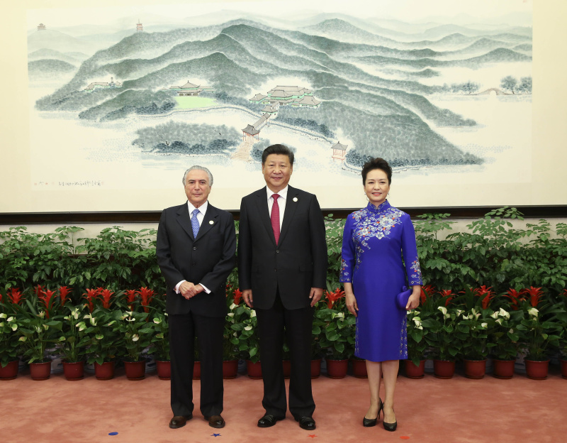 这是习近平和彭丽媛迎候巴西总统特梅尔。新华社记者 庞兴雷 摄
