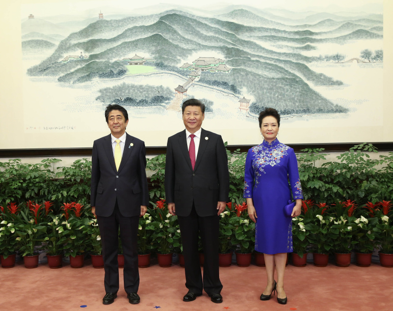 这是习近平和彭丽媛迎候日本首相安倍晋三。新华社记者 庞兴雷 摄