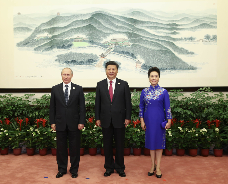 这是习近平和彭丽媛迎候俄罗斯总统普京。新华社记者 庞兴雷 摄