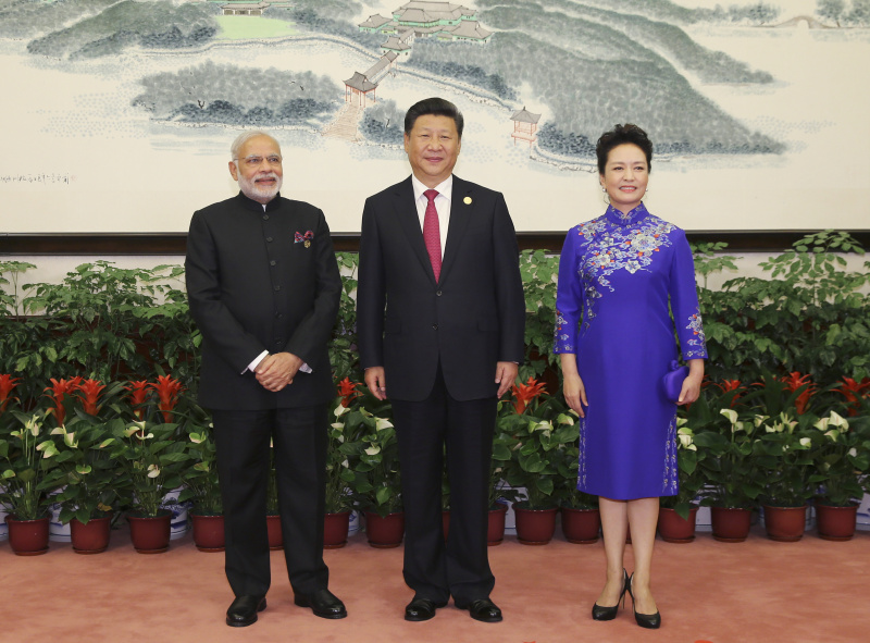 这是习近平和彭丽媛迎候印度总理莫迪。新华社记者 丁林 摄