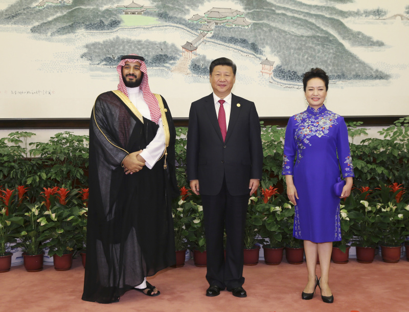 这是习近平和彭丽媛迎候沙特阿拉伯王储继承人兼第二副首相、国防大臣穆罕默德。新华社记者 丁林 摄