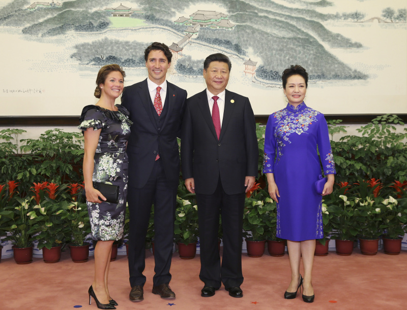 这是习近平和彭丽媛迎候加拿大总理特鲁多夫妇。新华社记者 丁林 摄