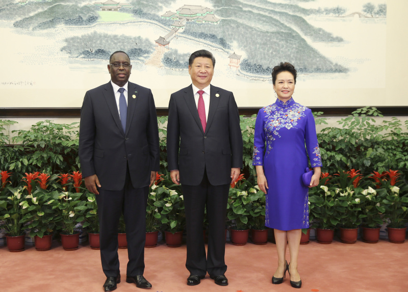 这是习近平和彭丽媛迎候塞内加尔总统萨勒。新华社记者 丁林 摄