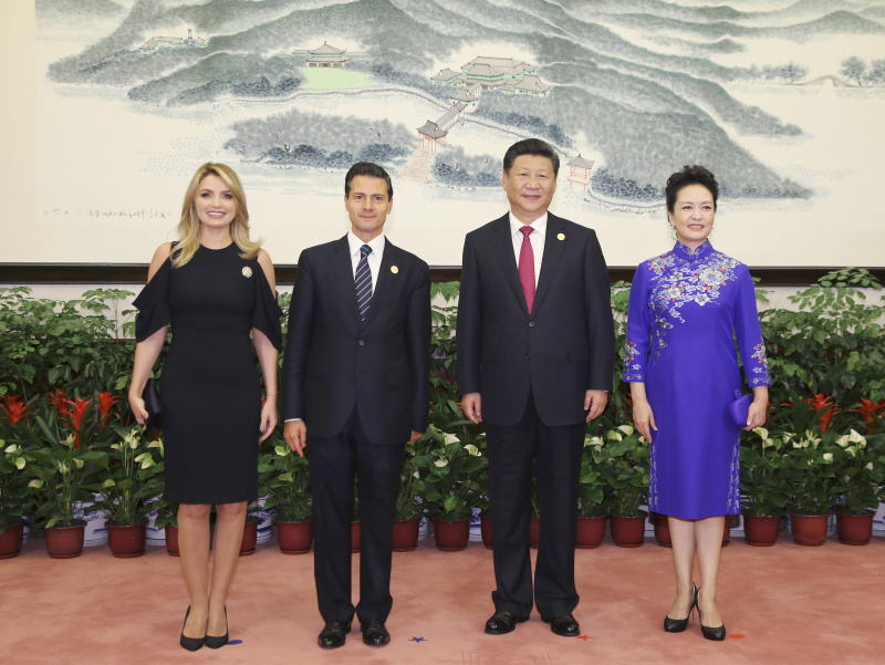 这是习近平和彭丽媛迎候墨西哥总统培尼亚夫妇。新华社记者 丁林 摄