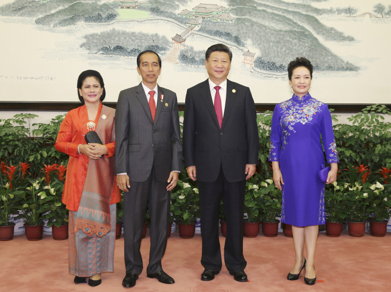 这是习近平和彭丽媛迎候印度尼西亚总统佐科夫妇。新华社记者 丁林 摄