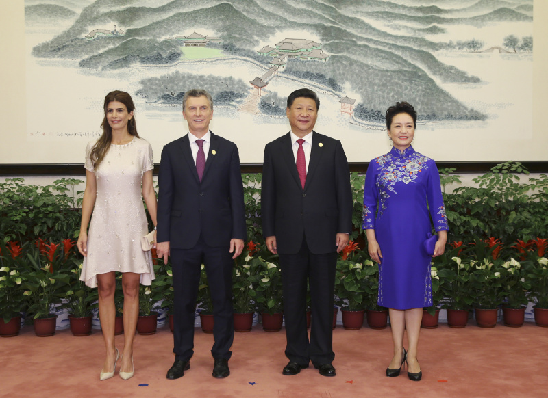 这是习近平和彭丽媛迎候阿根廷总统马克里夫妇。新华社记者 丁林 摄