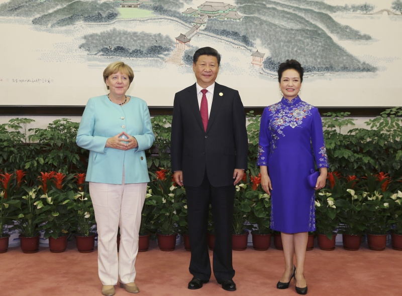 这是习近平和彭丽媛迎候德国总理默克尔。新华社记者 丁林 摄