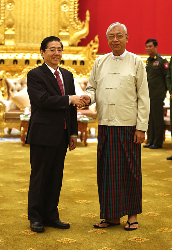 9月27日,缅甸总统吴廷觉(右)在内比都会见赴缅主持中缅第五次执法安全合作会议的国务委员、公安部部长郭声琨。新华社发 吴昂 摄