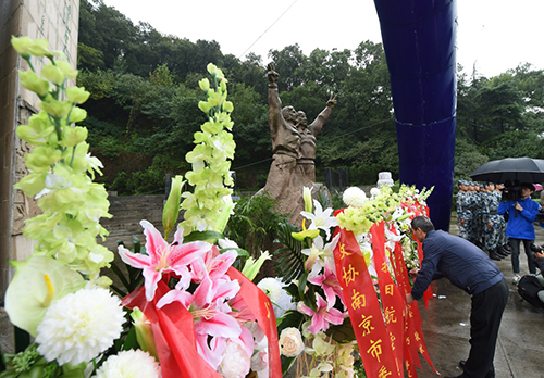9月29日,与会代表向烈士纪念碑敬献花篮。烈士纪念日前夕,江苏省南京市各界代表近400人在南京抗日航空烈士纪念碑广场举行凭吊仪式并开展纪念活动,缅怀抗日航空英烈。新华社记者 孙参 摄