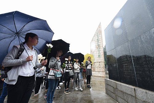 9月29日,参加活动的一批大学生代表在烈士纪念碑前凭吊,准备献花。新华社记者 孙参 摄