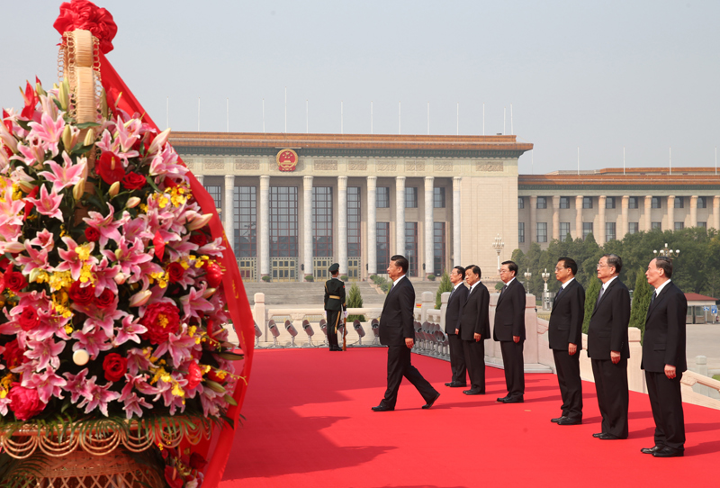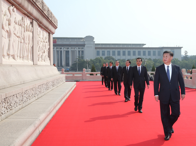 9月30日上午,党和国家领导人习近平、李克强、张德江、俞正声、刘云山、王岐山、张高丽等来到北京天安门广场,出席烈士纪念日向人民英雄敬献花篮仪式。这是习近平等党和国家领导人瞻仰人民英雄纪念碑。新华社记者 庞兴雷 摄