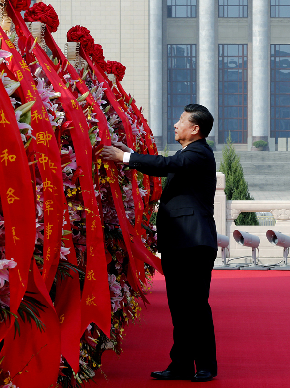 9月30日上午,党和国家领导人习近平、李克强、张德江、俞正声、刘云山、王岐山、张高丽等来到北京天安门广场,出席烈士纪念日向人民英雄敬献花篮仪式。这是习近平整理花篮上的缎带。新华社记者 鞠鹏 摄