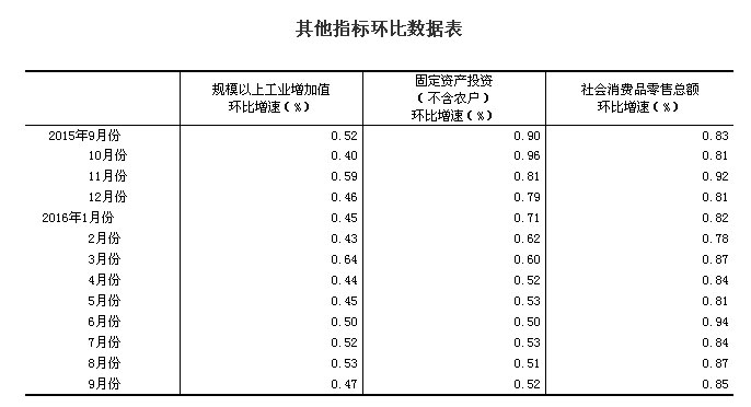 (2)根据季节调整模型自动修正结果,对近一年来各期国内生产总值、规模以上工业增加值、固定资产投资(不含农户)、社会消费品零售总额环比增速进行修订。修订结果及2016年三季度GDP环比数据、2016年9月份其他指标环比数据如下: