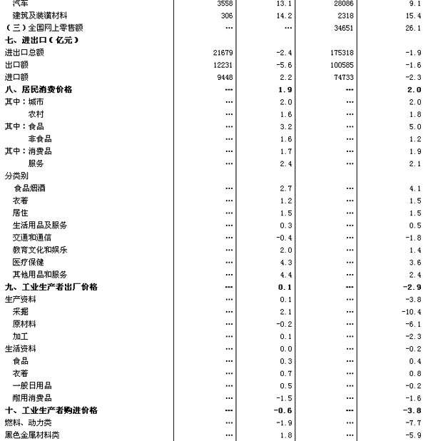 前三季度,居民消费价格同比上涨2.0%,涨幅比上半年回落0.1个百分点。其中,城市上涨2.0%,农村上涨1.8%。分类别看,食品烟酒价格同比上涨4.1%,衣着上涨1.5%,居住上涨1.5%,生活用品及服务上涨0.5%,交通和通信下降1.8%,教育文化和娱乐上涨1.4%,医疗保健上涨3.6%,其他用品和服务上涨2.4%。在食品烟酒价格中,粮食价格上涨0.5%,猪肉价格上涨21.2%,鲜菜价格上涨12.3%。9月份,居民消费价格同比上涨1.9%,环比上涨0.7%。前三季度,工业生产者出厂价格同比下降2.9%,降幅比上半年收窄1.0个百分点;9月份同比上涨0.1%,结束了同比连续54个月下降的态势,环比上涨0.5%。前三季度,工业生产者购进价格同比下降3.8%,9月份同比下降0.6%,环比上涨0.4%。