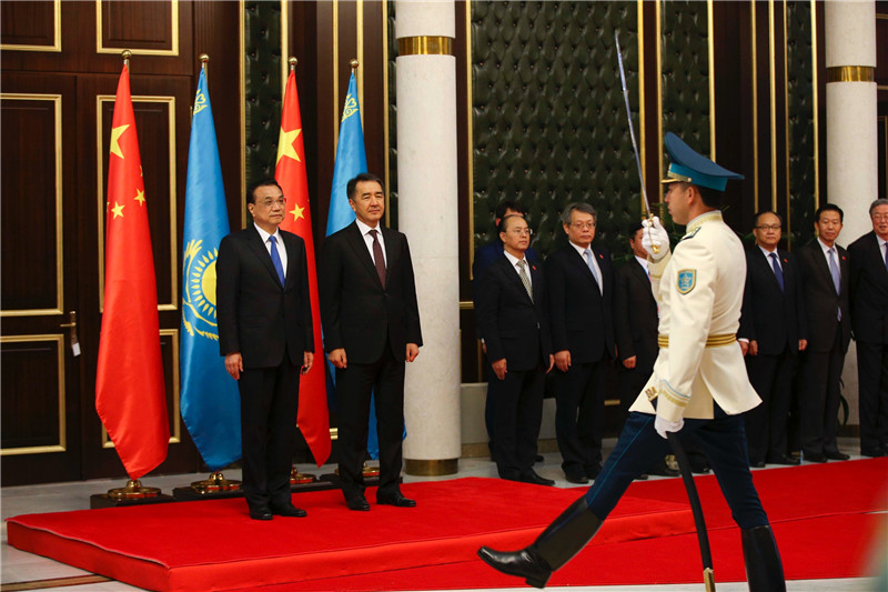 【哈萨克斯坦总理举行隆重仪式欢迎李克强到访】共同出席上合组织总理会晤后,哈萨克斯坦总理萨金塔耶夫3日下午先行回国,在机场迎候随后抵达的李克强总理,并为李克强举行隆重欢迎仪式。两国总理相互介绍双方主要官员后登上检阅台,军乐队先后奏响中哈两国国歌,李克强在萨金塔耶夫陪同下检阅仪仗队。