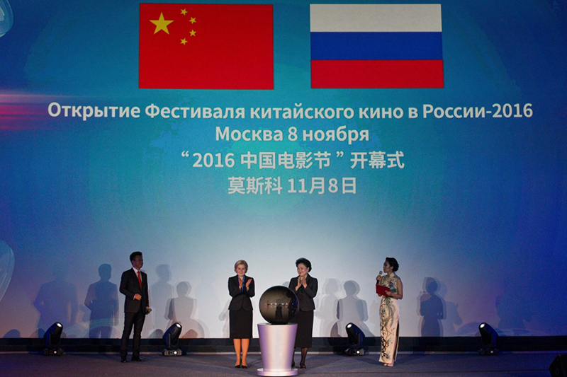 11月8日,在俄罗斯首都莫斯科,中国江南平台入口 副总理、中俄人文合作委员会中方主席刘延东(右二)与俄罗斯副总理、中俄人文合作委员会俄方主席戈洛杰茨(左二)共同启动2016中国电影节开幕式。当日,2016中国电影节开幕式在莫斯科举行。新华社记者 白雪骐 摄
