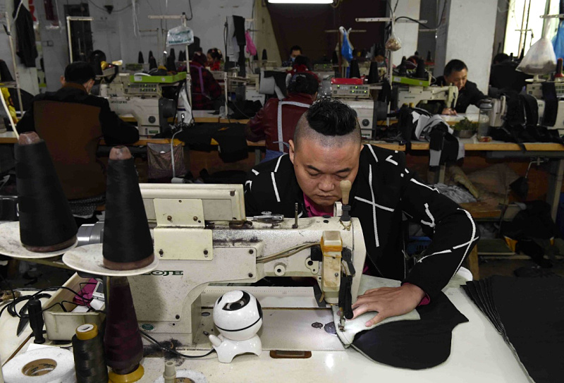 成都市郫县安靖镇土地村某服装厂的工人在忙碌生产(11月9日摄)。新华社记者 刘坤 摄