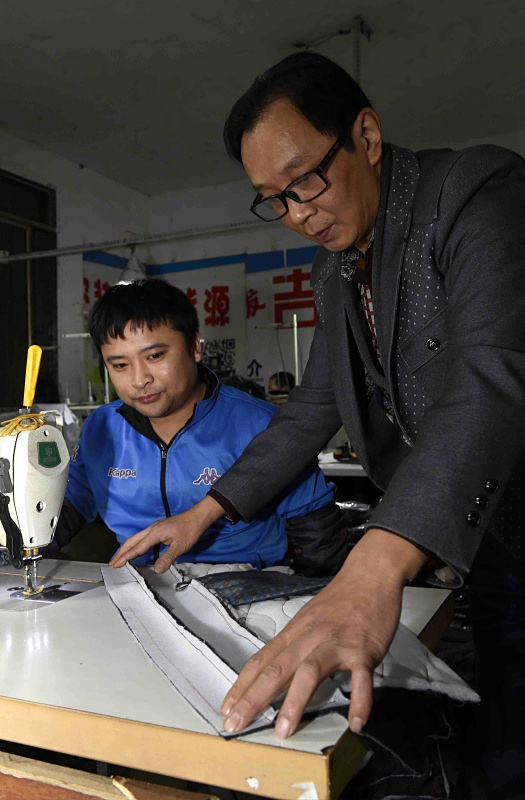 成都市郫县安靖镇土地村某服装厂有着30多年制衣经验的老师傅刘光杰(右)在检查面料缝制质量(11月9日摄)。新华社记者 刘坤 摄