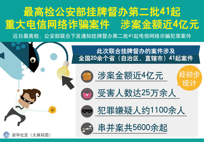 图表:最高检公安部挂牌督办第二批41起重大电信网络诈骗案件 涉案金额近4亿元  新华社发 大巢制图
