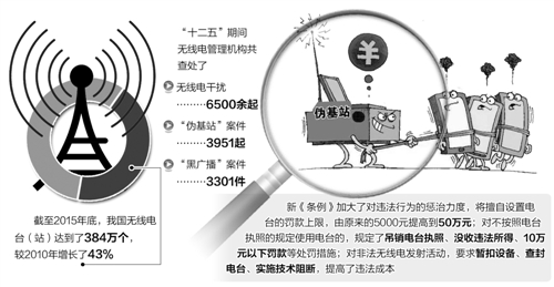 工业和信息化部政策法规司副司长范斌表示,截至2015年底,我国无线电台(站)达到384万个,较2010年增长43%。与此同时,频谱资源日趋紧张,无线电干扰也日益增多,私设电台特别是“伪基站”“黑广播”等问题突出,严重干扰了航空导航、公众通信等活动。“十二五”期间,无线电管理机构共查处了6500余起无线电干扰、3951起“伪基站”案件、3301件“黑广播”案件。