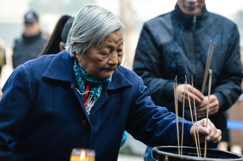 12月4日,南京大屠杀幸存者仇秀英在活动上上香。当日,第二场南京大屠杀死难者遗属家庭祭告活动在侵华日军南京大屠杀遇难同胞纪念馆举行。人们在纪念馆遇难者名单墙前悼念逝去的亲人。新华社记者 季春鹏 摄